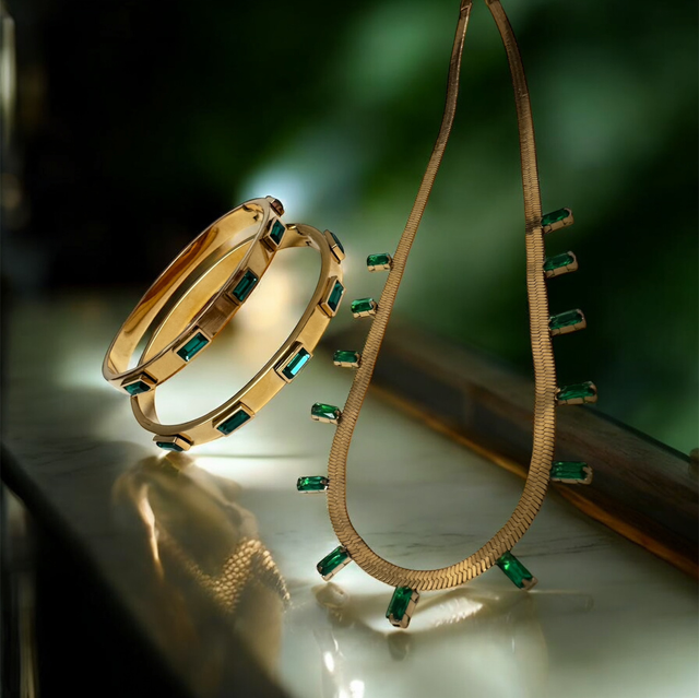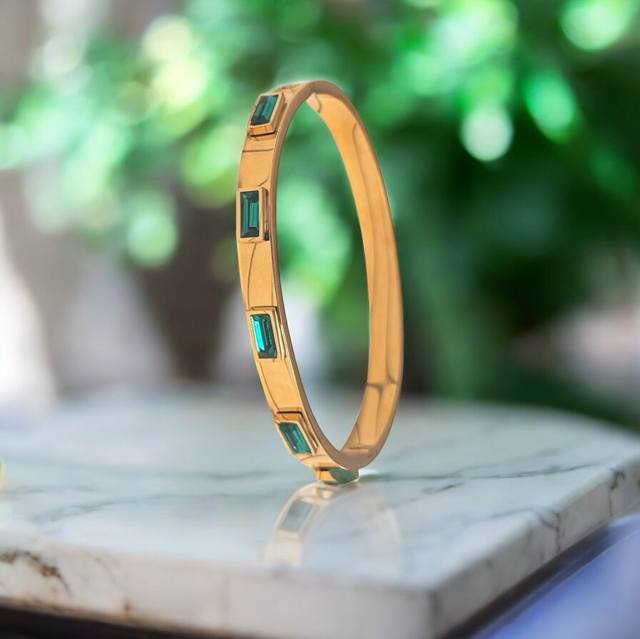 Apportez une touche de sophistication à votre poignet avec le jonc “Jade”, un bracelet en acier inoxydable 316L plaqué or 18K, décoré de perles vertes éclatantes. Son design minimaliste et contemporain s’adapte à toutes les tenues et se porte seul ou en accumulation avec d’autres bracelets pour un look unique.